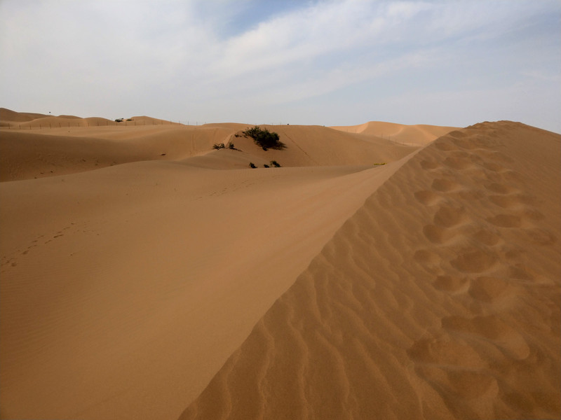 掠過馬戲團,我以沙丘上斗大的藍色沙坡頭三字為目標,爬了上去。沙坡雖然不高,卻有些陡,爬起來還是挺費勁,總感覺有一股力量不斷在「扯後腿」。