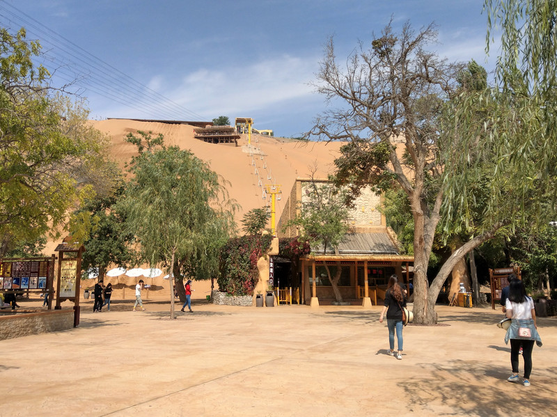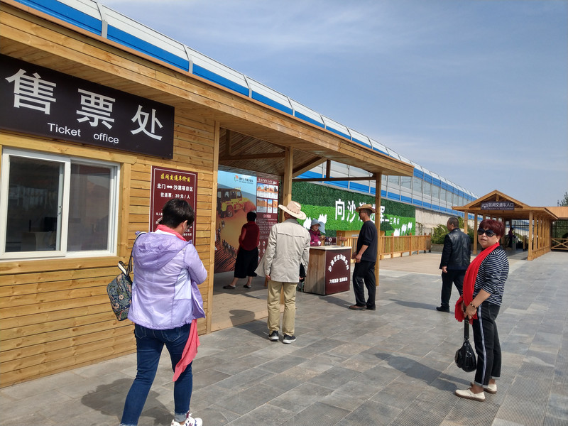 抵達沙坡頭之後,穿過停車場,走近偌大的入口區,真教人有種雀躍的感覺。而這裡的空氣瀰漫著和通湖草原全然不同的氣息,是充滿著絡繹的人氣,和人煙裊裊的通湖草原是天壤之別。我手裡握著手機,將網路上購買門票的二維碼打開,準備掃描入園。