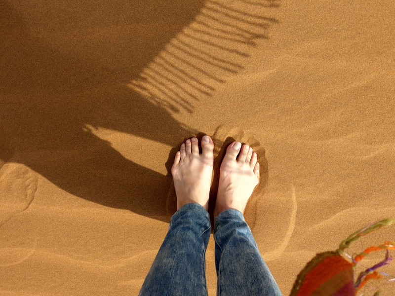 我褪去鞋襪,光著ㄚ子,讓雙腳赤裸地走踏在沙地上,讓自己更貼近這片我熱愛的黃色大地。沙子又細又軟,非常舒服,我在上頭來回行走,只是走著久了,仍是不敵滾燙燙的沙粒,教我只好投降,快步奔回傘下蔭涼處歇著。